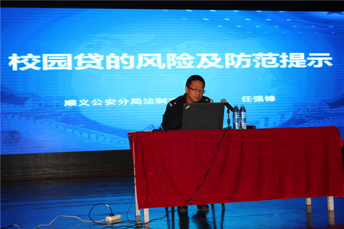 为加强我校学生网络信贷安全教育,提高学生的风险防范意识,4月25日下午2:00,在顺义团区委的支持下我校邀请邮储银行顺义支行综合管理部风险管理朱新影和顺义公安分局法制支队执法规范化大队副大队长任强锋在耿丹讲堂做了题为“校园贷”风险防范警示教育专题讲座,副院长刘林,全体学工及700余名学生代表聆听了讲座,讲座由团委书记高明平主持。