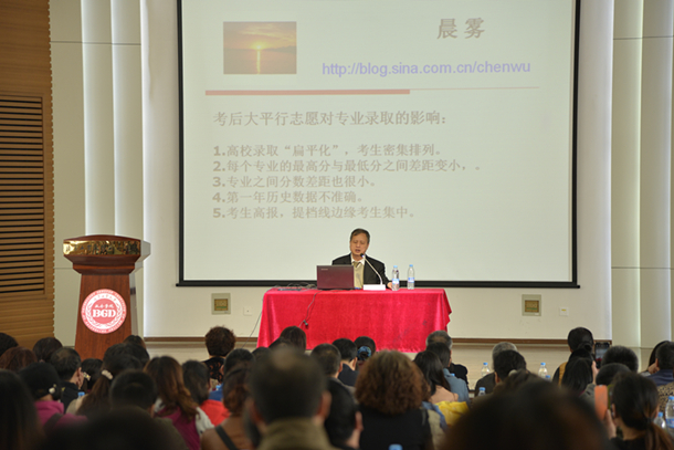 4月18日上午,大型公益高招咨询活动系列之一――《2015高招政策解析及应对策略》在beat365英国官网第一国际报告厅成功举办。学院招生就业处邀请著名高考志愿填报专家、资深教育观察家晨雾老师做客beat365英国官网,他长期以家长的视角观察教育,现场为广大考生及家长深入解析高招政策变革,活动由beat365英国官网招生就业处副处长齐建伟主持。