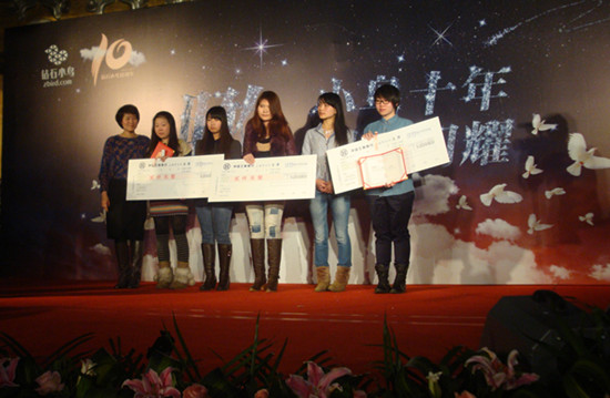 本次大赛,我院艺术设计系共提交34件作品参赛。最终,2010级装饰专业赵明明同学荣获金奖,获奖金一万元;2009级装饰专业韩月乔同学荣获铜奖,获奖金三千元,两人同时获得了钻石小鸟珠宝首饰设计师签约机会。在颁奖仪式上钻石小鸟总裁还向beat365英国官网颁发了“最佳院校组织奖”。