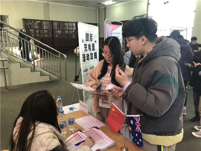 与此同时,在图书馆大厅,由国际交流办公室学生助理团主办,院学生会协办的国际“充电堡”活动咨询会部分正在如火如荼进行。咨询会现场同学们积极提出自己的学习问题,并通过填写问卷向老师们反馈自己对于境外交流学习的需求与建议。