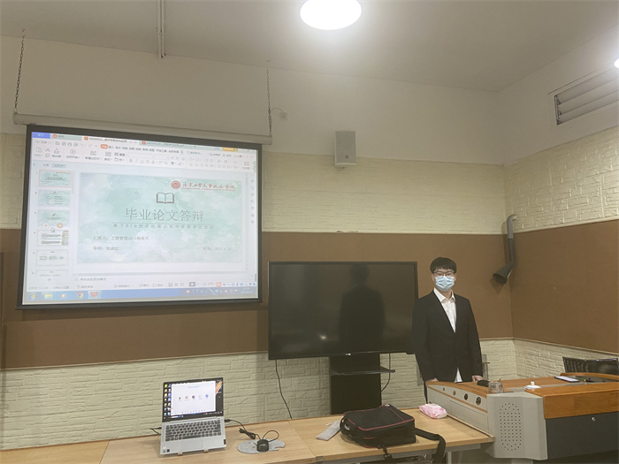 本次答辩过程分为学生陈述、老师提问、现场答辩、成绩评定等环节。在陈述环节,参加答辩的学生向老师详细阐述论文选题目的、意义、论文框架及在论文写作过程中的收获等内容;随后,答辩老师针对论文内容提出相关问题,在考察学生对专业知识及论文论点掌握程度的同时,有针对性的对学生论文存在的问题提出建议,最后在答辩小结中,老师对学生的答辩表现进行了总结。