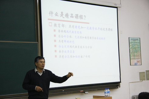 蒋教授以“我们的责任是培养人才”开题,结合自己主持精品课程建设与参与精品课程评审工作的体会,介绍了精品课程建设指标体系和课程评审中应重视的问题,以及课程教学在人才培养中的重要作用。课程是本科教育的主战场,而精品课程是提高教育质量的火车头,根据学院办学定位,分类建设精品课程是提高高等教育质量的根本途径。他从重视课程教学研究与实践、课程教学瞄准培养目标、重视教学设计、体现能力导向的教育、研究性教学作支撑、其他值得注意的问题等七个方面做了精彩讲解。