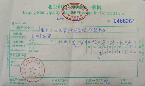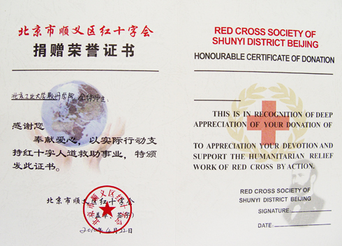 募捐活动现场爱心踊跃,师生员工纷纷慷慨解囊,1元、5元、10元、20元、50元•••200元,这也许不算多,但却表达了师生员工对玉树灾区人民的一份爱心。机械系、语言系通过回收废旧物品等形式换取救助善款。仅4月22日上午半天时间我院师生员工5000多人为地震灾区捐款28936.3元。随后,郭书记代表学院将善款送到了北京市顺义区红十字会,希望通过红十字会将全院师生员工的爱心与祝福带到灾区人民身边,帮助他们渡过难关,重建家园。募捐活动受到了北京市顺义区红十字会的高度赞扬,并为我院师生员工颁发了捐赠荣誉证书。