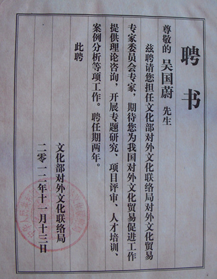 在2012年11月13日文化部对外文化联络局召开“2012年度文化产品与服务‘走出去’申报项目专家评审及座谈会”上,正式成立了文化部外联局对外文化贸易专家委员会,我院经济与管理系主任吴国蔚教授被聘为首批专家。首批17名专家分别来自北京大学文化产业研究院、清华大学、第二外国语大学、中央财经大学、对外经贸大学、中国科学院战略研究中心、中国社科院等著名学府。该委员会以政策咨询、理论研究、项目评审、人才培训、案例分析等为主要职能,为加强政府对文化产品和服务“走出去”的扶持和引导,鼓励文化企业不断创新和拓展海外市场,做出专业评价的贡献。(经济与管理系供稿)