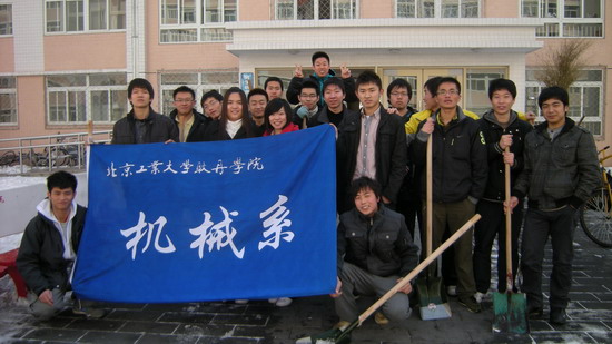 男生宿舍2号楼前地处阴面,下完雪后,积雪很难融化,给同学们的出行带来很大麻烦。为了同学们的出行方便和安全,机制091班自发行动,跟后勤部门借来铁锹和扫把,清扫楼前积雪。同学们齐心协力,分工合作,把楼前的积雪打扫的非常干净,为全校师生营造了一个干净整洁的校园环境。