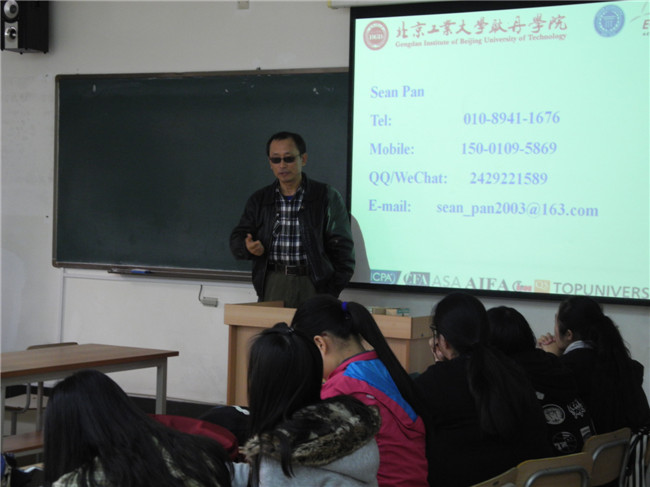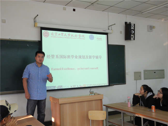 基于国庆前对经济与管理系两个国际班全体同学关于留学意向、雅思考试和教学建议等方面的深入调研的基础上,潘玉庆老师向国际班的同学们介绍了ACCA免考规则、2+2、3+1等留学模式的利与弊,同时从各专业所学课程的角度深入为国际班的同学们说明了国外院校对应课程的安排,并向同学们介绍了英国、澳洲、美国等留学热门国家与相应推荐院校的录取条件,为同学们未来留学的申请提出了合理性的建议。