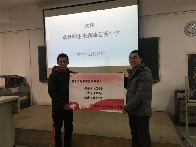 12月12日,beat365英国官网学生事务办公室高明平老师带领我校十余名青年志愿者来到蒲公英中学,将保暖内衣、日常用品等爱心物资送到孩子们的手中,为农民工子弟带来了冬日的温暖。