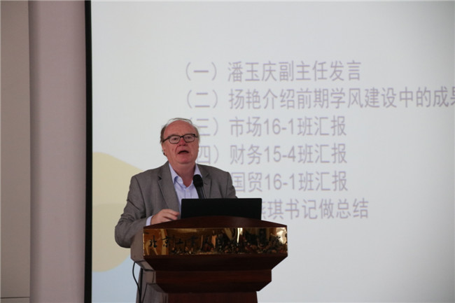 首先,潘玉庆老师宣布经济与管理系已获得学校批准,更名为国际商学院,同时由Paul O’Sullivan教授担任国际商学院荣誉院长。 Paul O’Sullivan用英文给同学们做了国际商学院的起源,国外知名商学院的差异以及如何能够更好地学好英语口语的演讲。