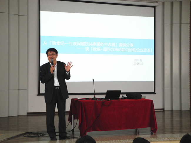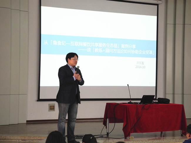 洪东盈先生首先介绍了餐饮电商生态的大背景和隐食纪的业务模式,顺应移动互联网的大势,企业战略定位为互联网餐饮电商共享服务中心。通过隐食纪的发展历程,分享了教练+顾问方法论在企业诞生到转型与创新的变革中的知和悟。洪东盈先生在报告的过程中同师生不断地互动,从打造互联网餐饮共享服务生态链的案例中,剖析国际级方法论是如何助力企业变革的。
