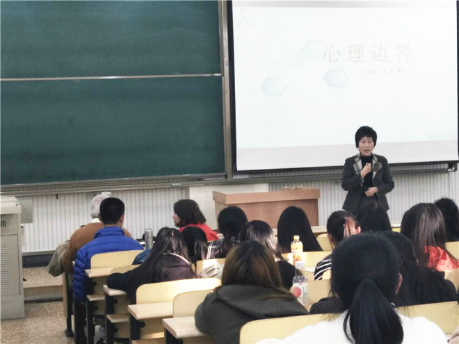 人文学院院长李洁首先与同学们做了互动游戏,通过游戏对什么是心理边界做了正确的阐释,让同学们对心理边界问题进行了交流。随后她与同学们分享了做心理咨询时的案例,进一步的展现了心理学的魅力,并从心理学研究对象,研究内容等方面与同学们进行交流,告诉同学心理学的神秘力量,通过学习心理学让同学可以认识内外世界,可以加深对自身的认识与了解。