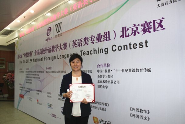 此次比赛由教育部高等学校外国语言文学类专业教学指导委员会、教育部高等学校大学外语教学指导委员会和上海外语教育出版社联合主办,北京第二外国语学院承办。来自中央财经大学、北京邮电大学、北京航空航天大学、北京语言大学、中国石油大学、中国传媒大学等20多所北京高校的20余名具有教学专长的外语教师参加比赛。比赛分为复赛与决赛两个环节,复赛形式为一堂20分钟的授课,决赛形式包含说课,内容为组委会现场提供的1000字左右的英语文章,准备时间为30分钟,与回答评委提问两部分。我校赵靖娜老师在复赛中凭借其扎实的教学基本功和过硬的专业素养,在24名选手中 跻身前九名,顺利晋级决赛。在最后的决赛中,赵靖娜老师顶住压力,稳定发挥,最终获得大赛二等奖。