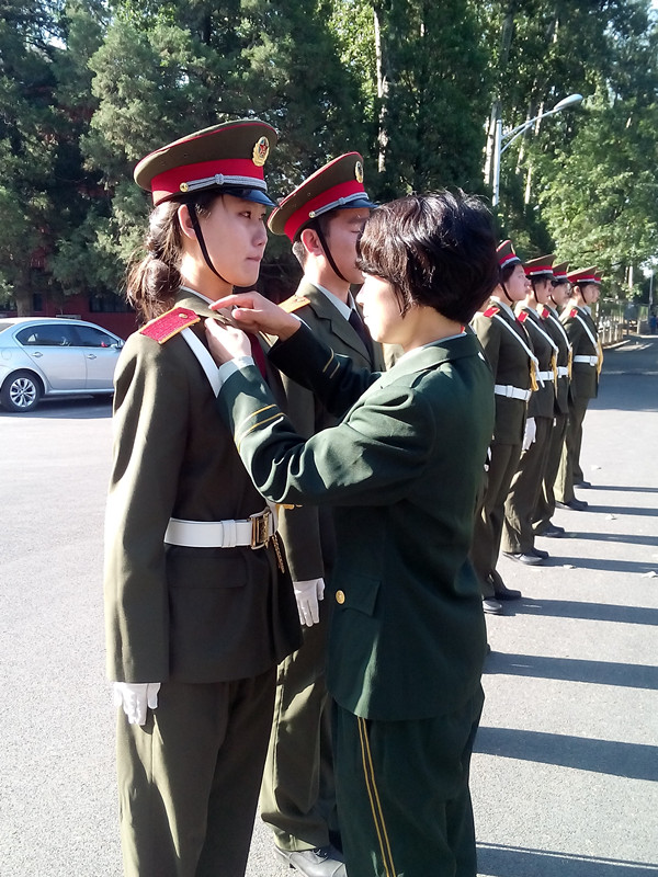 自管会和职业发展协会的同学们有序退场,国旗班全体队员集合在国旗下,由退伍老兵,国旗班指导员李明和杨杰两名同学在《驼铃》的音乐声中,依次为国旗班队员摘掉领花,国旗班同学们眼含泪水,向着国旗做最后的告别。
