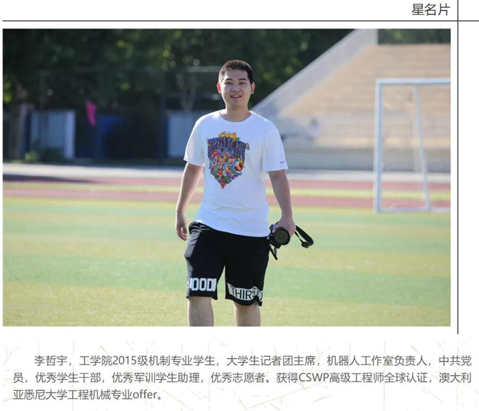 李哲宇:就是机器人工作室和大学生记者团。前者让我学会了大量的专业知识,而后者又教会了我如何工作,如何管理,如何与人沟通。而在学习之中错误是会经常出现的,这时需要的是克服困难而不是逃避。比如在机器人工作室里设计的前几个产品可以说是漏洞百出,连接方式过于繁琐,结构过于笨重,大量的受力等问题没有考虑进去,并且在设计思路上也与学长出现分歧。这时渐渐的就有人退出了,有的是因为繁琐的设计工作而退缩了,有的是因为时间磨去了兴趣而渐渐地离开了,也有的是因为与人发生了口角而愤愤离去。但如果想要成功所需要的是与常人不同的坚持吧。尤其在进行四旋翼无人机的设计工作中,除了春节休息了5天之外,其余时间我一直在学校的机器人工作室之中进行着设计工作。一件符合先进行业标准的机电产品至少进行3次的修正工作。