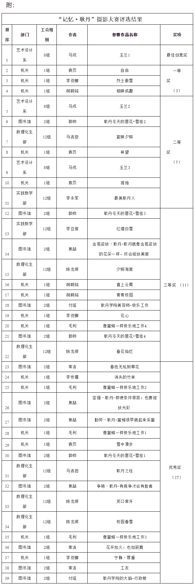 为了提升校园文化,丰富教职员工的文化生活,抒发广大教职员工热爱学院的情怀,学院工会特举办以“记忆·耿丹”为主题的摄影比赛。大赛自3月29日至5月6日征集摄影作品,受到广大教职员工的支持,反响热烈。此次大赛共收到50余幅参赛作品,以耿丹校园生活为主,涵盖校园风光、特色建筑、师生活动以及精彩的生活瞬间。 5月10日,学院工会邀请艺术设计系三名专业教师组成评审团,对参赛作品进行集中评审,共评出最佳创意奖1名,一等奖3名,二等奖7名,三等奖11名,优秀奖17名。全部获奖作品将于5月中旬展出,并对获奖摄影者进行表彰。部分作品还将制作为精致装饰画固定展于学院图书馆、教工之家等地。