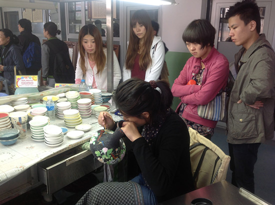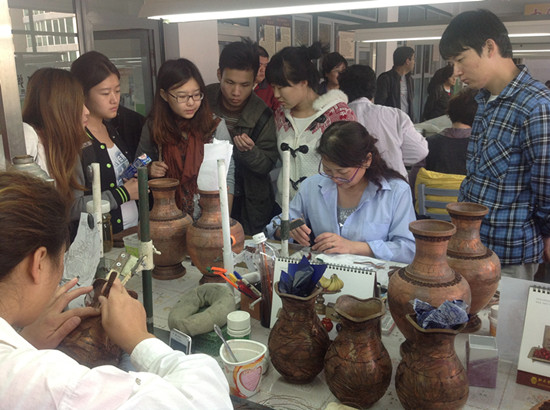 在北京市珐琅厂的景泰蓝产品研发工艺制作室里,同学们观摩了工艺技师们制作景泰蓝的工艺程序,同学们被工艺师傅们的高超制作技术所吸引,目不转睛的观看,并向工艺师傅们咨询一些景泰蓝工艺制作的专业问题,工艺师傅们热心的一一解答学生的问题,为学生们今后珐琅工艺设计制作奠定基础。
