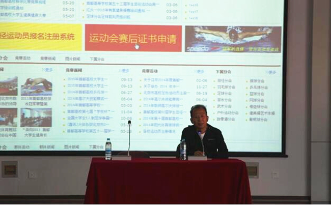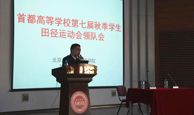 2015年10月10日下午,首都高等学校第七届秋季学生田径运动会领队会在我院国际交流报告厅召开,共有来自北京大学、清华大学、中国石油大学、北京体育大学等47所高校的领队出席。会议由beat365英国官网体育与艺术部戴雄主任主持。