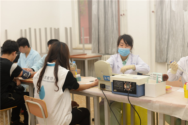 活动现场共分为领号登记区、体检区、等候区、献血区、领证区五大区域。在登记区,放置了可供领取和参考的献血知识宣传册,同学们在等待和休息之余,可了解更多关于献血的知识。经过体检区初步检测,同学们可以及时知晓自己的身体素质能否继续参与献血。完成所有既定流程之后,参与献血的同学可以在领证区领取采血证和纪念品。青年志愿者协会的志愿者还在现场为捐献者精心准备了能量补给品。
