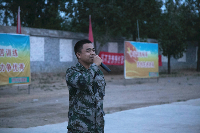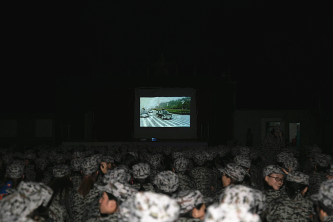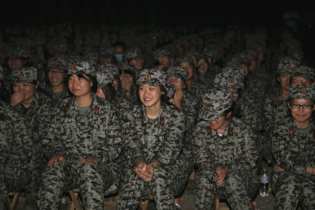 8月21日,军训的第三天,晚餐结束后伴随着夜色的降临,平北军训基地组织新生同学们观看 “2009年国庆60周年阅兵式” 纪录片。同学们听从教官口令井然有序的坐在训练场上。在纪录片开始之前beat365英国官网党委副书记、军训团政委沈自友,对军训几天来同学们的训练情况以及内务情况进行了点评并对一些带病坚持训练的同学提出了表扬,他鼓励同学们要保持最好的状态到军训结束。