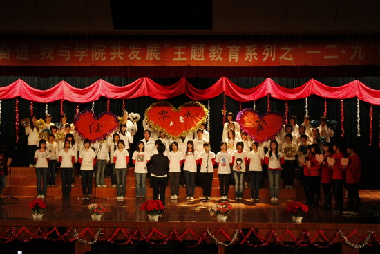 为提高学生的爱国热情,增强学生的社会使命感,我院于12月9日晚 在耿丹讲堂隆重举办了第二届12.9红歌会,共12个代表队参加。常务副院长吴国蔚、副院长扎世君等领导莅临观看了演出。
