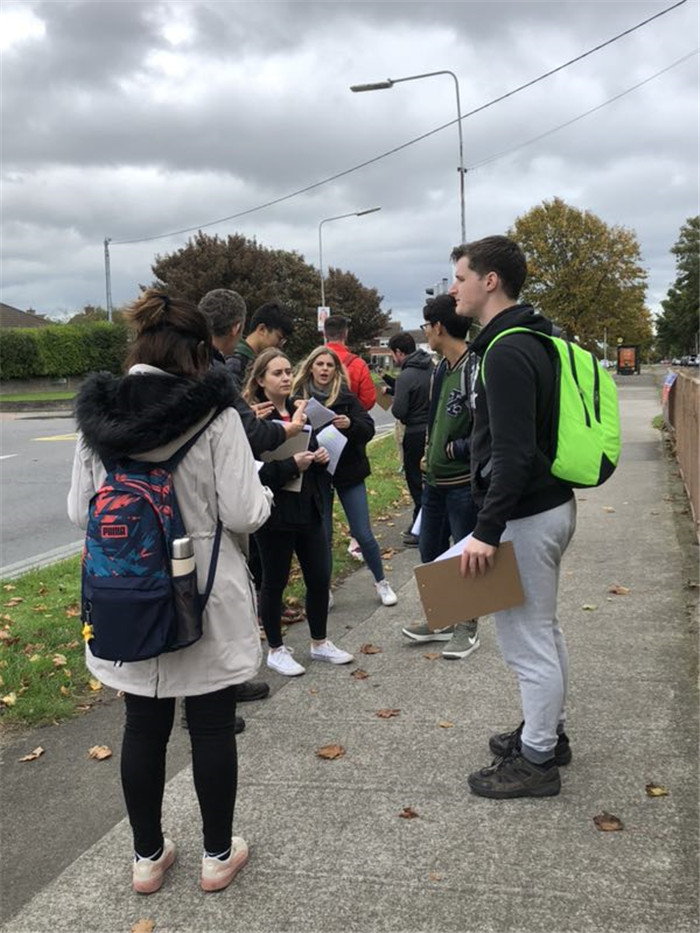 在返回途中,外教与中教引导学生观察发现都柏林周边区域的特色建筑与交通特点,以及城乡结合等的街道和布局的不同,积极展开讨论,各抒己见,营造了良好的学习氛围。期间城规专业的学生与爱尔兰本土学生就爱尔兰、中国乡村及城乡规划专业等方面进行了交流,两国学生都体现出对彼此国家城市和乡村极大的兴趣,大家集思广益,收益颇丰。