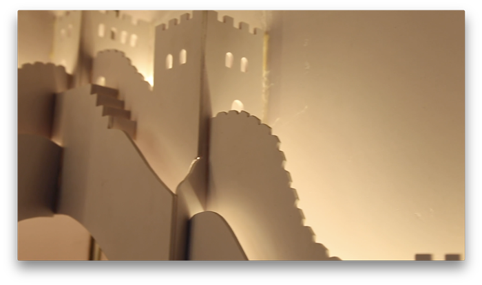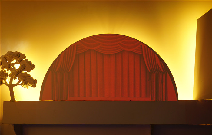 《北京街建筑纸雕》是在“盛华宏林–北京街”真实项目基础上延伸出的毕业设计,选取了白塔、国贸、国家大剧院、中央电视台等北京著名建筑,采用剪影的艺术形式制作的交互式光影装置。作品中的长城做了立体的前后三层设计,有砖块形状的边缘与楼梯的细节。作品中,古代与现代建筑相结合,高低有致的错落排布突出了层次感。在国家大剧院的剪影上做了小人跳舞的投影,丰富了国家大剧院的纸雕建筑,使之更加生动。作品使用了黄色调的暖光灯,看起来舒适而安逸。