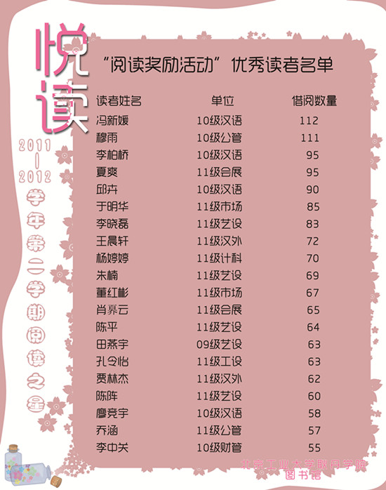 10月10日,图书馆公布了2011―2012年度“阅读之星”名单,冯新媛、穆雨等20名学生成为本年度“阅读之星”。