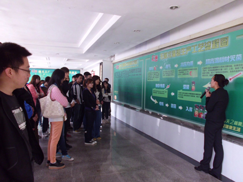 在燕京啤酒总厂,同学们观看了反映“燕京啤酒”成长道路和企业精神的记录片。在相关工作人员的讲解下,同学们分别在“企业与发展展示厅”,“生产调度指挥中心”,“发酵车间”,“啤酒过滤机车间”,“产品总装车间”等工作和生产区域进行了现场观摩和实践学习。在汇源果汁总厂的生产线旁,同学们观看了果汁从生产到罐装的全部过程,对产品加工制作流程有了更加全面直观的了解。