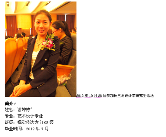 谢婷婷:我在2012年9月考入浙江农林大学艺术设计学院设计学专业,研究方向为设计艺术理论与创作研究。