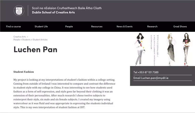 潘露辰同学在视传专业教师与国际部教师的推荐与帮助下,于2014年9月赴DIT进行专业学习。就读期间,她选择了《Image Making》、《Design for Digital Media》为自己的主要研究方向,并通过自己的努力获得了两个方向导师John short与Brenda Duggan的认可。