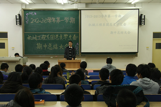 2012年11月7日晚6点30分,机械系团总支学生会期中总结大会在BJ07教室召开。机械工程系党支部书记、学工办主任王文雅老师、团总支书记靳新广老师、2011级辅导员李贤老师、2012级辅导员宋占涛老师和团总支学生会成员及各班学生代表参加会议。
