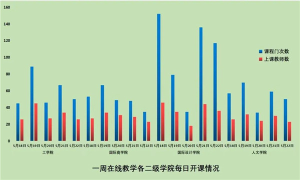 5月18日-5月22日期间,共有在线教学课程244门、1338门次;共有同学41860人次上课;共有196位教师进行了在线教学。学校积极落实了在线教学第十三周对同学“全覆盖”的要求,基本保证同学每天在线学习。