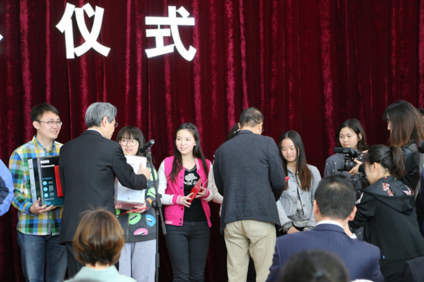 俞敏洪和大泽英俊一同为获奖同学颁奖