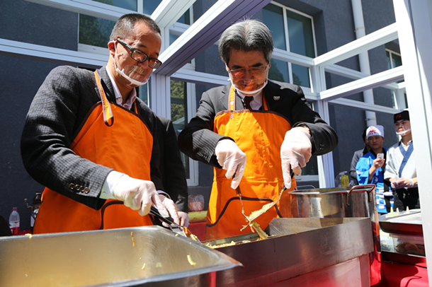 樱花园揭幕仪式结束之后,俞敏洪理事长和大泽英俊先生又一同来到在樱花大道进行的充满日本风情的美食活动。樱花树下,充满日本风情的美食引人驻足,大泽董事长和俞敏洪理事长一起品尝了日本特色美食,并亲自动手制作。同时,在愉快融洽的氛围中,两位还就中日文化各抒己见,与同学们展开面对面交流,分享经验与智慧。(综合办公室供稿)