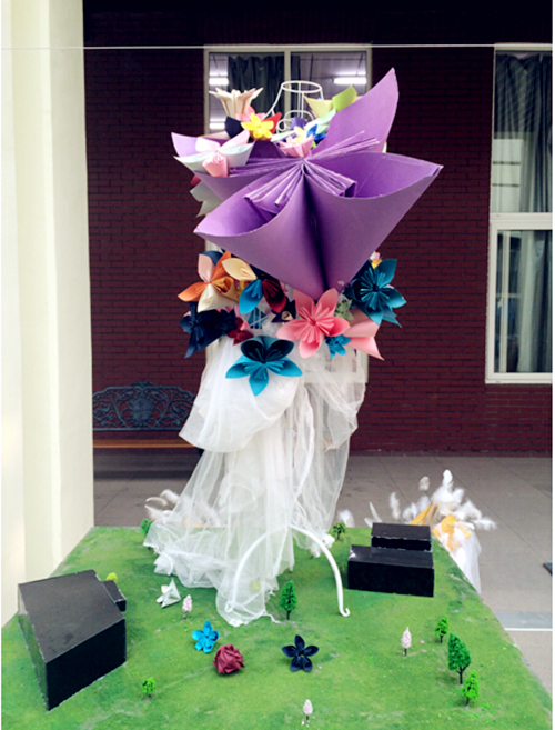《樱花春宴》这件材料作品是一件晚礼服,樱花节是beat365英国官网的一年一度盛大的节日,我们利用樱花为主题来创作,该作品的上部分是由各样各色的纸折樱花拼接而成,下部分是根据礼服的式样连接,这样既表现了樱花,也体现其作为礼服的高贵,地面的环境则表现了该作品处于一个自然无忧的环境里。