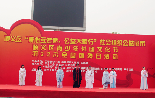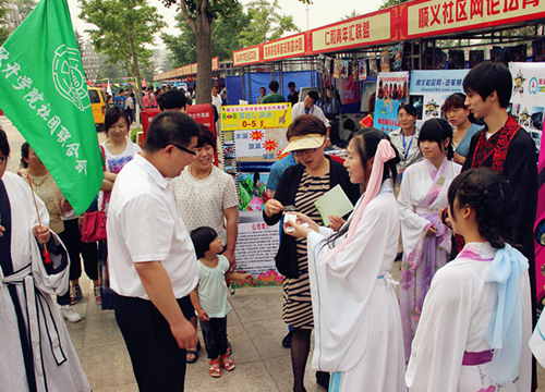 19日上午光明广场人头攒动,来自社会各界的人士参加了此次顺义区青少年文化节。WorkBox-DIY社的同学们通过展示社团的手工作品以及现场教学来宣传废物利用和低碳生活,陌樱汉服社举办古代投壶礼以及汉服展示宣传华夏民族汉家文化,每个社团都根据社团特色开展游戏与到场群众进行互动和宣传。10点整,光明广场的主表演区开始了青少年社团的自主展示,我院陌樱汉服社通过精心准备的“汉家古代女子成人礼”演出向各界宣传了汉服,获得了观演群众对传统文化及汉服复兴的共鸣。
