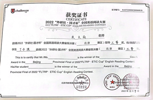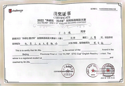 本次北京市复赛由教育部高等学校大学外语教学指导委员会、外语教学与研究出版社等单位联合举办,来自北京市各高校的选手从激烈的校级初赛中崭露头角,最终进入阅读大赛复赛。北京市复赛于2022年10月29日下午举行,采用线上比赛的形式,共150分钟,包括主观题和客观题两部分,全方位的考察学生的阅读能力。我校国际商学院财务20-2班学生丁子渲校内初赛第一名和特等奖的突出成绩成功晋级到北京市复赛,并且获得北京市三等奖。以下为获奖学生丁子渲和指导教师宋文丽的获奖证书。