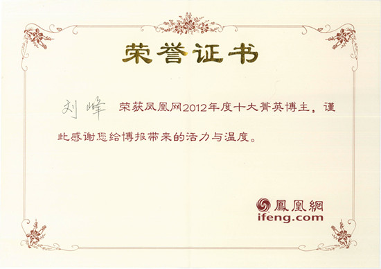 凤凰网2012年度十大菁英博主,是根据博主活跃度、博文质量、点击量及网友投票结果相结合,凤凰网博报评出“十大菁英博主”。此次颁奖礼由凤凰卫视著名主持人闾丘露薇主持,凤凰网CEO刘爽、COO李亚出席颁奖礼并发表讲话。