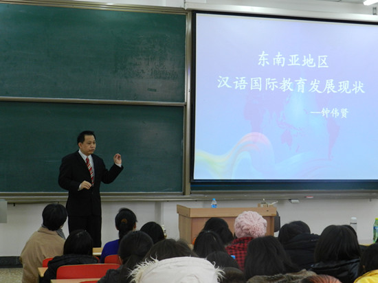 11月28日,马来西亚柔佛州华校董教联合会常务董事、2012年中马国际教育交流活动筹划主任、马来西亚青年运动全国总会中央讲师钟伟贤先生来我院交流访问,并为应用语言系对外汉语专业师生做“东南亚地区汉语国际教育发展现状”专题讲座。