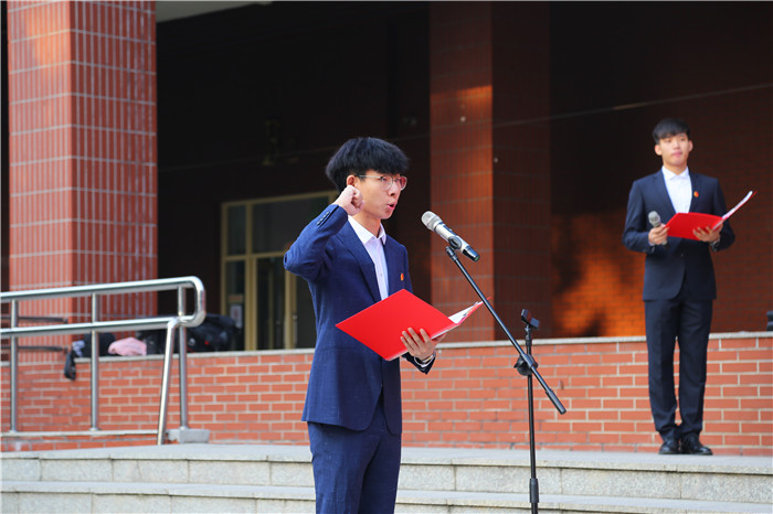 在迎风飘扬的五星红旗下,参加活动的耿丹学子在团员代表财务18-5班艾天齐同学的的带领下,面向团旗庄严宣誓、齐唱《团歌》,用坚定的誓言和美好的歌声表达了自己“青春心向党,建功新时代”的初心和使命。