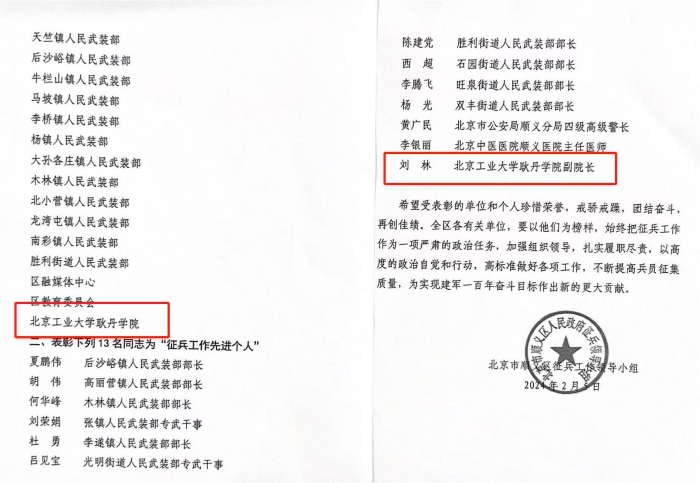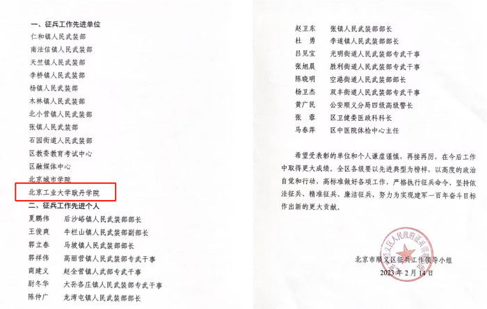 一直以来,我校高度重视征兵工作,把征兵工作作为学校落实立德树人根本任务的重要环节来抓,推动征兵工作与思政教育紧密结合、征兵宣传与就业服务协同配合,形成了“征兵动员+思政教育+就业服务”全校一盘棋的良好局面。学校已累计向部队输送近800多名优质兵源,连续多年获评北京市、顺义区“征兵工作先进单位”,为国防建设贡献力量。