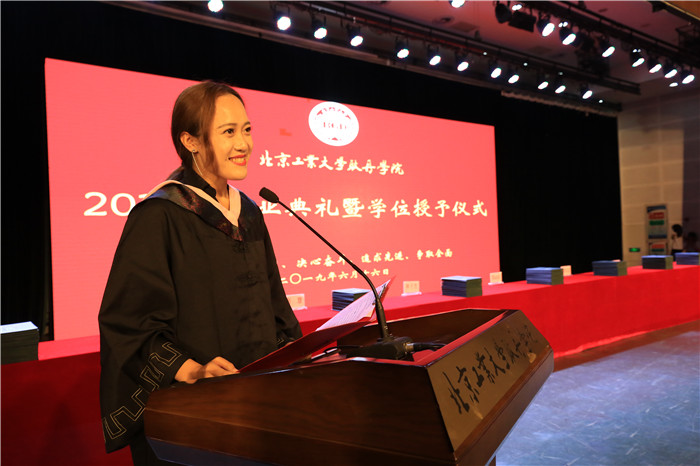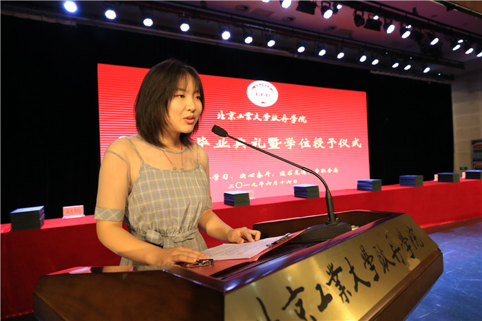 国际商学院单文博老师,国际设计学院李靓老师分别代表全校教师在毕业典礼上发言,他们在发言中向圆满完成学业的优秀学子表示衷心祝贺,希望2019届耿丹学子在走出校园,走向社会,感恩母校,报效祖国。