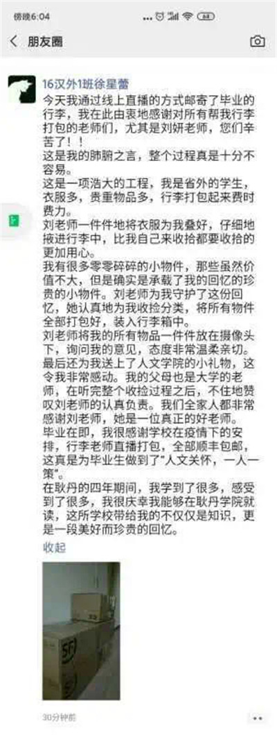 行李寄思念、浓浓师生情。2020年的毕业季,因疫情防控阻隔了同学们的回校相聚之路。为确保每一位毕业生能够顺利毕业,做好未返校毕业生行李打包安置工作,我院充分尊重同学的诉求和感受,拟定了 “一对一”、“点对点”、“一人一舍一策”的线上“云打包”、暖心“毕业寄”方案。自7月2日起,在信息服务中心老师们的网络技术保障下,在招生就业办公室、国际交流办公室、图书馆、教学事务办公室等行政部门老师们的支援下,辅导员、专业老师、宿舍阿姨们走进宿舍,化身“打包员”,与同学们视频连线“云见面”,提供“零距离”的贴心服务。老师们耐心地整理,悉心地打包,精心地贴上母校寄语,希望每一位收到包裹的毕业生能感受到母校的关怀和温暖。