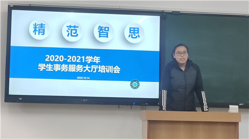 2020年10月14日下午,在B区教室201教室举行了2020-2021学年学生事务服务大厅培训会。会议由学生事务办公室考菲菲老师主持,全体学生事务服务大厅的学生志愿者参会,学生事务办公室副主任高明平老师莅临指导。