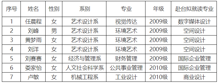 经过各系选拔、审核和学院严格筛选,我院共选派7名优秀学生赴台湾建国科技大学进行为期一学期的学习交流,他们分别来自艺术设计系、机械工程系、经济与管理系、人文社会科学系,其中,任晨程、卢敏2位同学获得了建国科技大学提供的免学费、免住宿费以及12,000新台币的奖学金奖励。