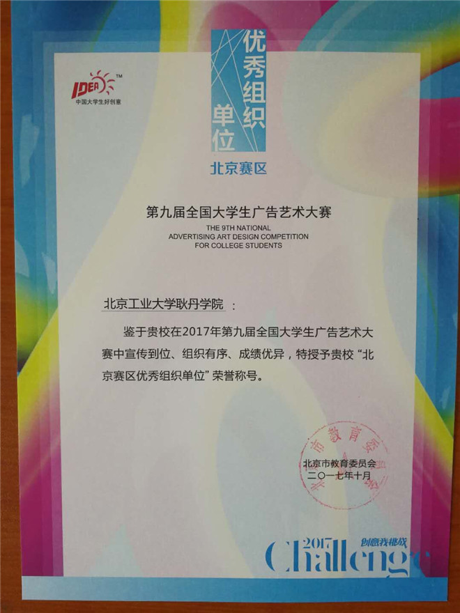 在“第九届全国大学生广告艺术大赛”中,侯锐淼老师指导的熊凤逸等三十余名同学共获得北京赛区36个奖项,其中一等奖1项,二等奖2项,三等奖5项,优秀项26项,学院获得优秀组织奖,侯锐淼老师获得优秀指导教师奖。大广赛是由教育部高等教育司主办,是全国规模最大、参赛作品水平最高的国家级赛事,本届大广赛共收到参赛作品近三十万组。