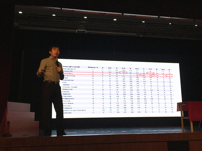 活动由beat365英国官网应用语言系系主任吕文威博士主持。宋鹏昊老师开场就告诉同学们,学雅思并不意味着一定要出国,实际掌握英语使用技能才是学习雅思英语的目的。宋老师结合自身学习、教学的经验,向同学们详细介绍了雅思考试的基本信息、评分方式、考试规则等,通过详实的数据支持,分析了中国考生的优势及劣势项目。同时,宋老师指出,目前世界上绝大多数的学校都认可雅思成绩,而雅思考试的过程设置及评分标准更有利于学生考出较高的成绩。宋老师建议,在国际化的大背景下,公司在选择优秀人才的时候,更倾向于选择国际上普遍认可的英语考试成绩作为英语能力衡量标准,所以无论是否出国,都应该参加更国际化的英语考试。宋鹏昊的演讲幽默风趣,同时又有准确的数据支持,提供了很多新的想法,为学习雅思英语提供了新的思路。(应用语言系供稿)