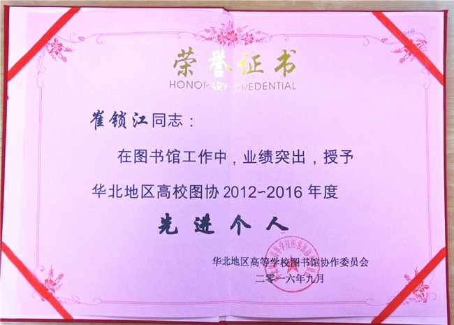 近日,华北地区高校图协第三十届学术年会在南开大学图书馆隆重开幕,来自北京、天津、河北、山西、内蒙古等华北大学高校图书馆的代表及专家学者300余人参加会议。会议对华北地区2015-2016年度做出突出贡献的先进集体和个人进行了表彰。我院图书馆荣获华北地区高校2015-2016年度“先进集体”荣誉称号,图书馆崔锁江老师荣获“先进个人”荣誉称号。