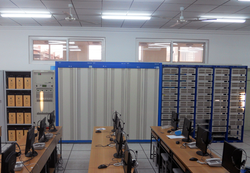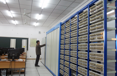 大容量程控数字电话交换实验系统是电信运营商在用设备,在国际上首先采取全分布控制方式,广泛应用于世界各地。该系统除做局端汇接外,还可在本地进行用户测试与模拟,是通讯设备生产企业和电信运营商技术培训和考核的实操系统。(工程训练中心供稿)