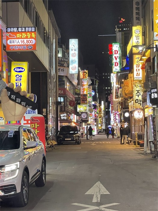 明洞有名的安东鸡拌饭、各种特色的街边美食……繁华的明洞街、热闹的弘大夜市让我体会到了韩国城市独特的魅力,弘大的街头表演、路上陌生人的问好。