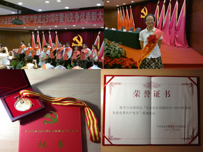 获得创先争优优秀共产党员荣誉称号的白安琪同学曾任学院团委副书记,她牢记党的宗旨、坚定理想信念,做最好的学生、当最优的干部,丰富的大学生活给予她深厚的文化积淀。她现已奔赴社会工作岗位,祝愿她在新的工作岗位上进一步完善和提升自己,争取更大的成绩,为学院争光添彩。(综合办公室供稿)